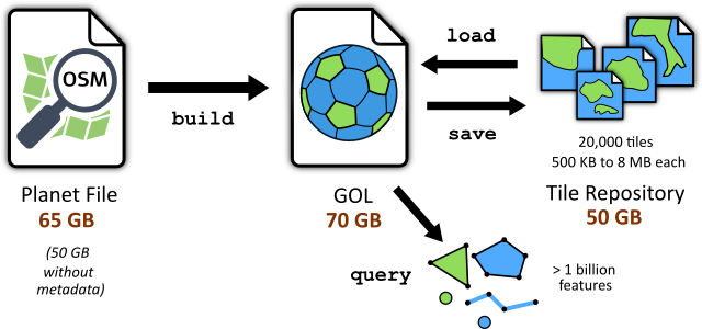 The heart of GeoDesk is a spatial database engine, which stores OpenStreetMap data in a Geographic Object Library (GOL). You can create GOLs from .osm.pbf