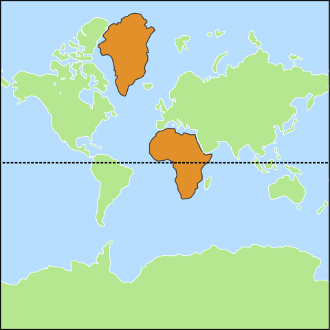 Greenland and Africa appear to be roughly the same size — in reality, Africa is 14 times larger than Greenland.