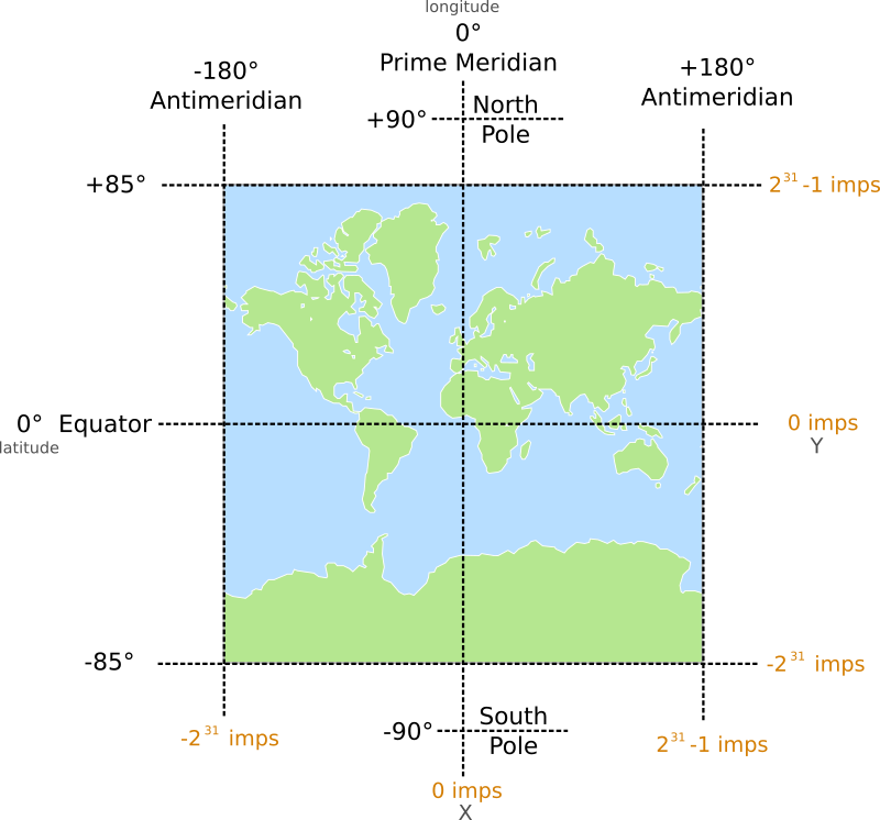 - Coordinates use the full 32-bit integer range; the minimum and maximum X coordinates represent the Antimeridian (+/- 180 degrees longitude)